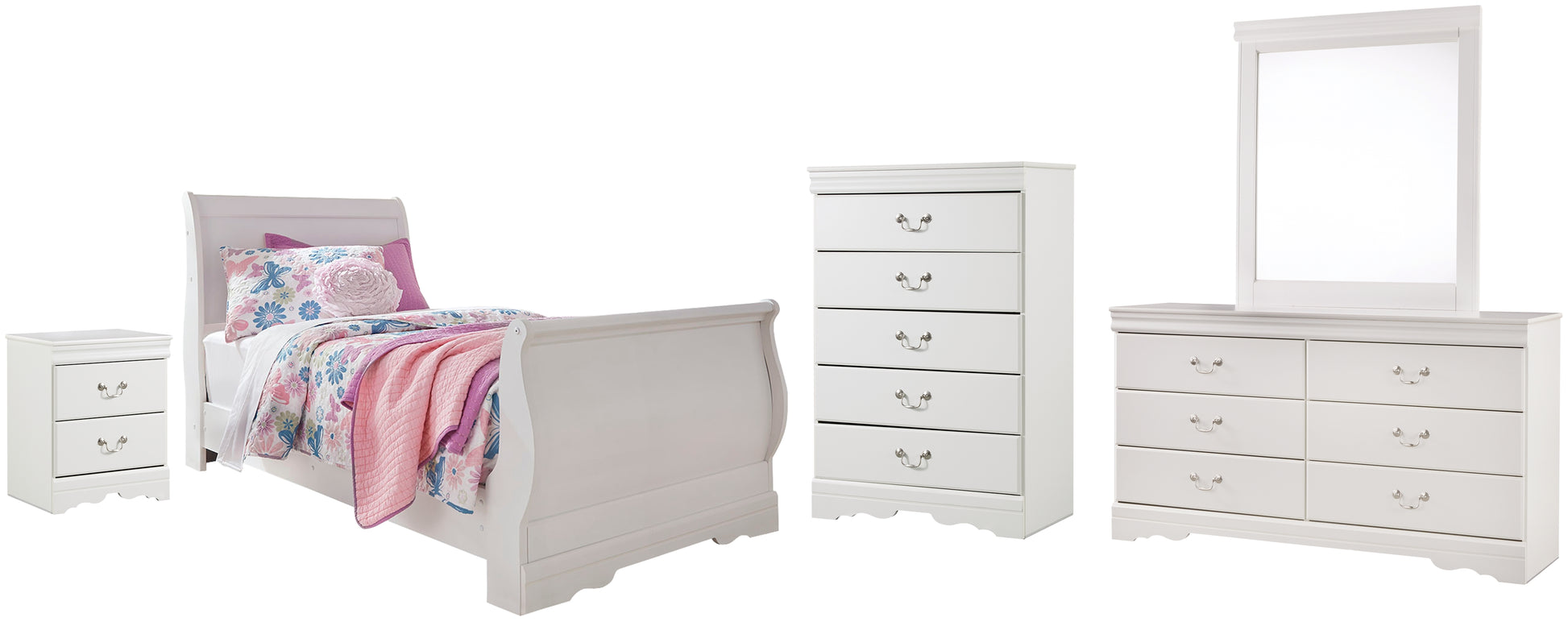 Anarasia Twin Sleigh Bed with Mirrored Dresser, Chest and Nightstand